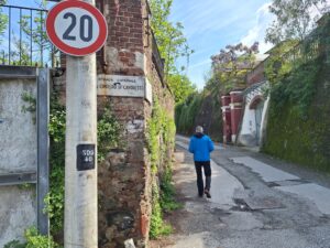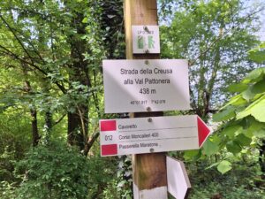 Il sentiero n° 12 sale decisamente fino ad incontrare la strada della Creusa (il termine “creusa” indica una strada tortuosa). Quindi si segue la strada asfaltata fino al n. civico 27 dove si continua a sinistra sulla sterrata