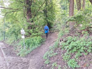 Da lì si svolta a destra e, seguendo la strada Parrocchiale, si raggiunge piazza Freguglia, la piazza principale di Cavoretto. Al fondo della piazza, a sinistra, si trova una fontana. Da piazza Freguglia si prosegue, leggermente in discesa, in viale XXV Aprile. Dopo alcune curve sulla destra inizia il bosco in cui ci si inoltra con un sentiero segnalato con palina di legno.