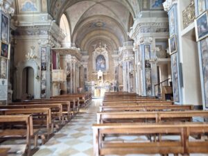 Per altra strada nel parco per ricongiungersi poco prima del punto in cui siamo entrati, da lì si segue lo stesso percorso. Fatta una sosta di preghiera alla bella parrocchiale di Cavoretto. La facciata, in muratura intonacata, si sviluppa su due ordini, di cui il primo è di larghezza maggiore, scanditi da trabeazione e incorniciati da lesene. Essa è coronata da un timpano triangolare. La pianta è a navata unica con cappelle laterali e abside a terminazione piana di larghezza leggermente inferiore alla navata.