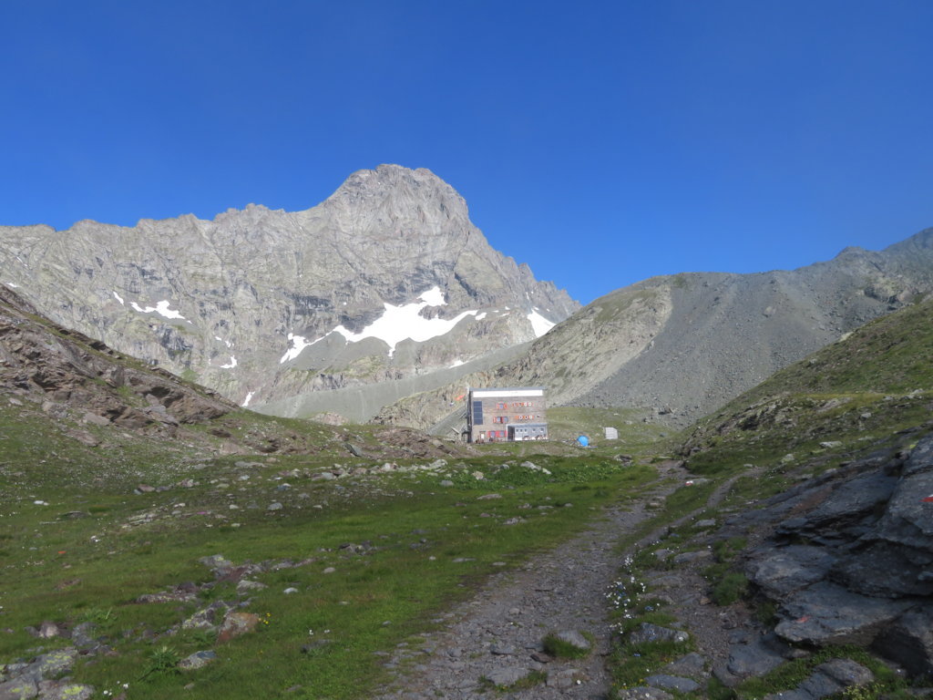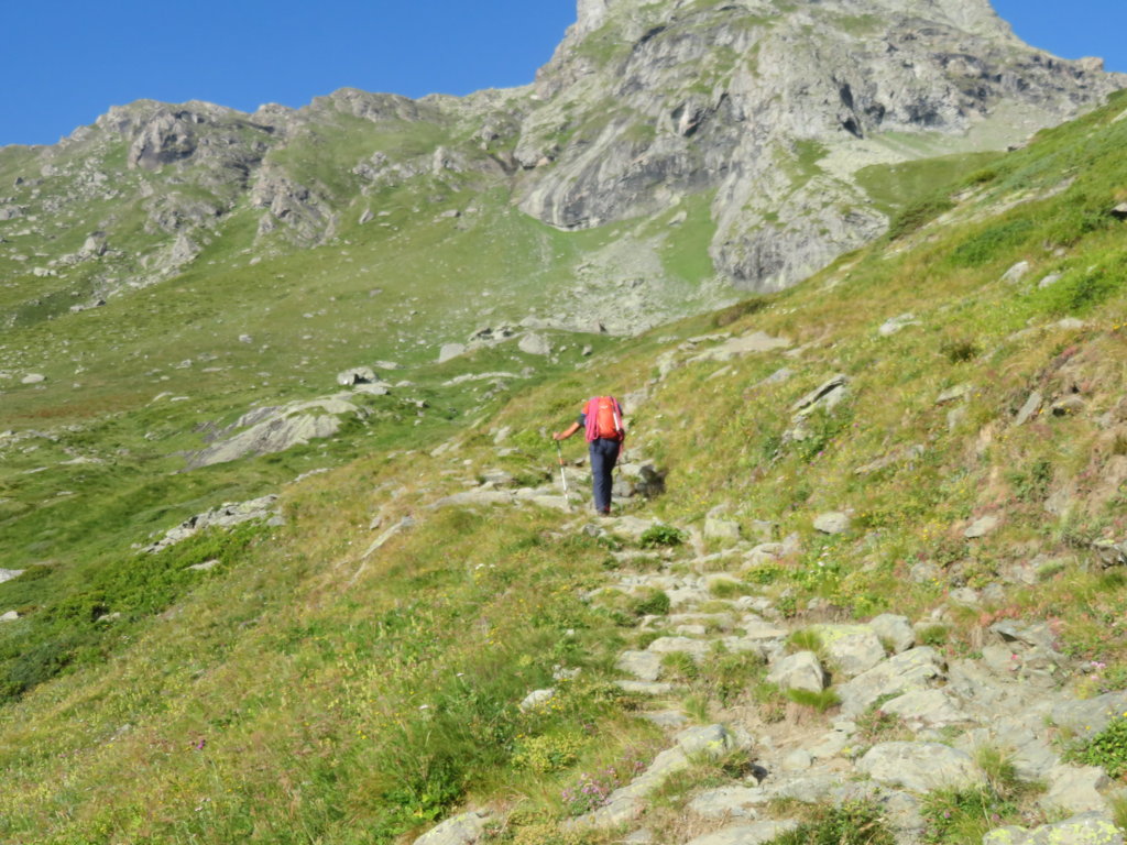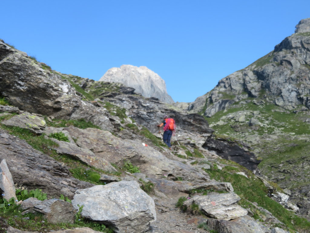 Si parte dal retro del rifugio. Nel nostro caso non salita la morena del Ghiacciaio della Bessanese ma presa la via diretta che risale un erto e faticoso pendio pietroso.