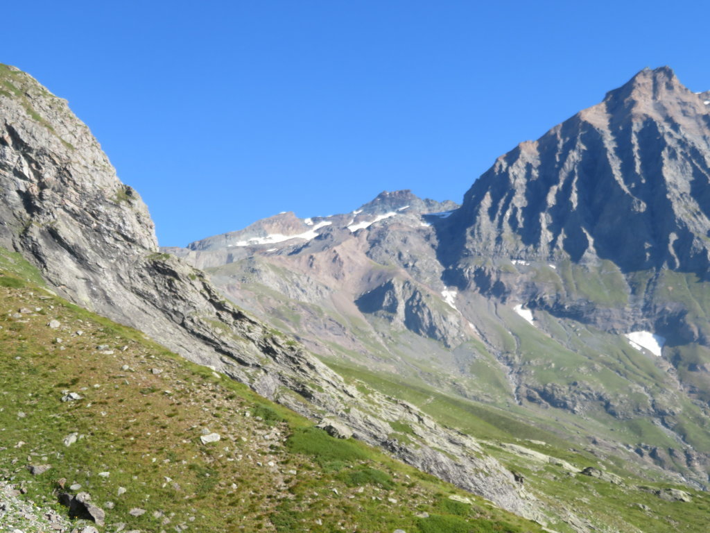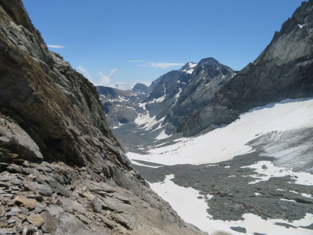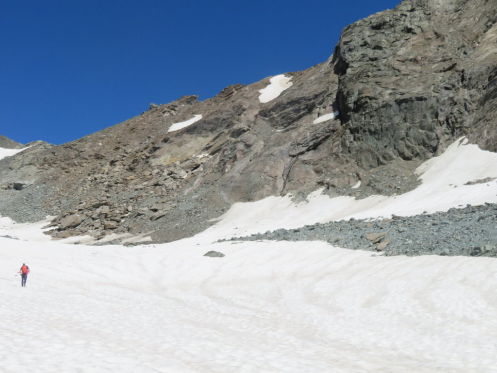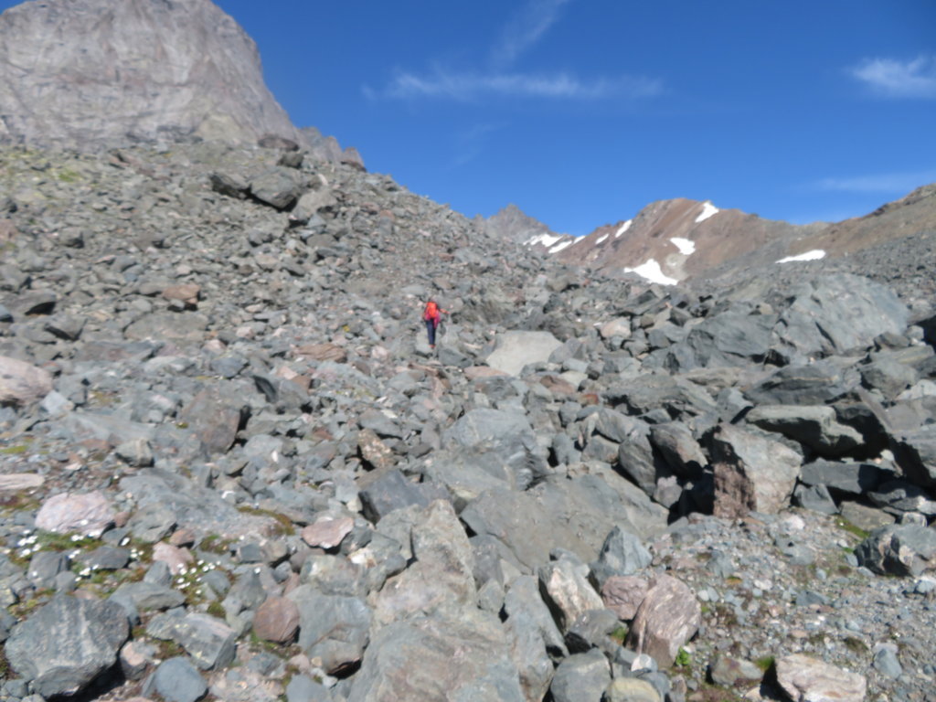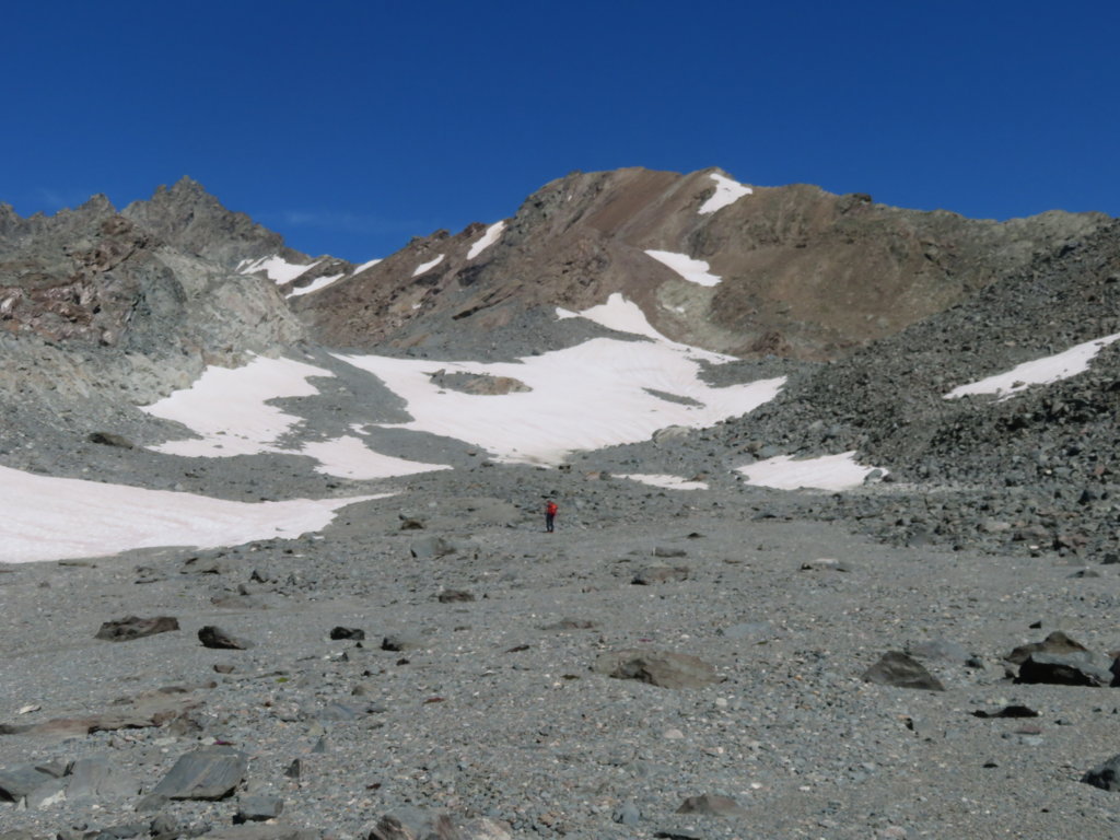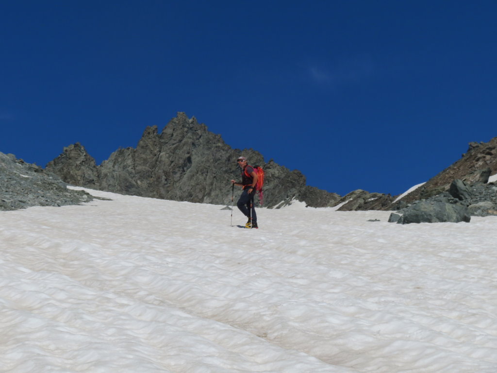 Più avanti la pendenza diminuisce decisamente e si attraversano zone con piccoli detriti e nevai puntando al colle che si apre tra il Dente Meridionale del Collerin e la nostra meta: la Punta Adami.
