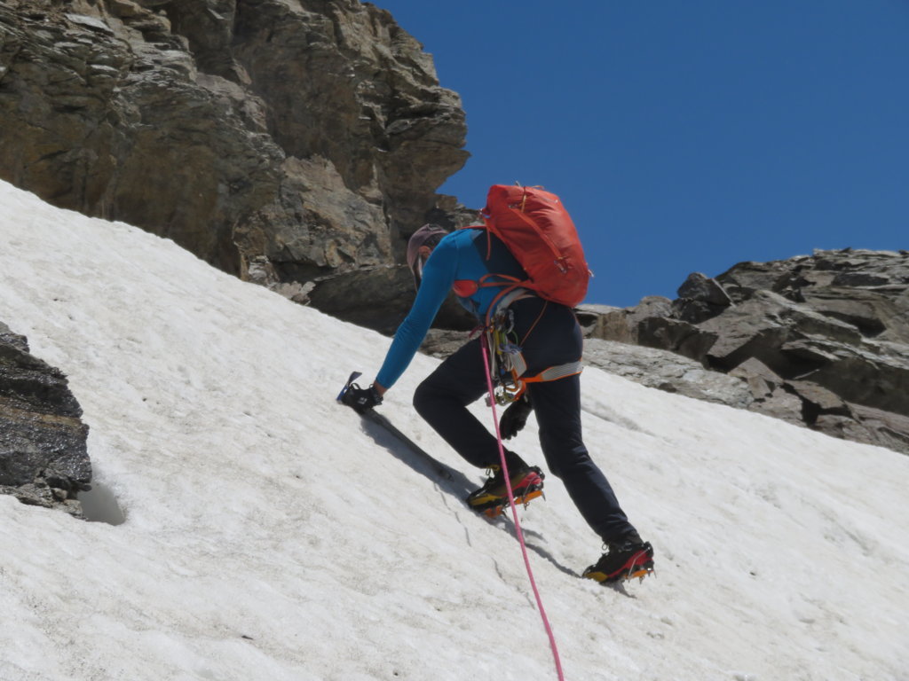 Nel nostro caso la neve era dura e dopo esserci incordati abbiamo calzati i ramponi e utilizzando la picca risalito l’ultimo tratto prima della cresta (sicurezza fatta con la picca messa nella neve).