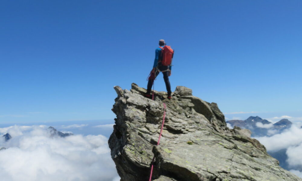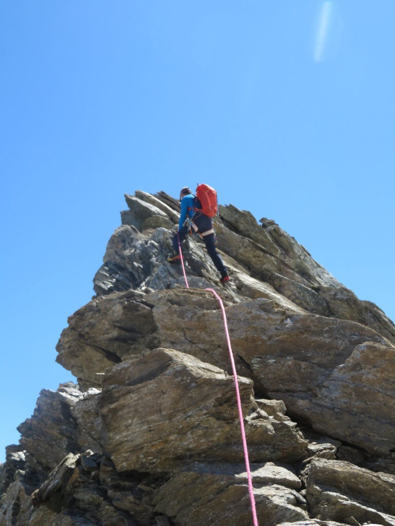 Quindi si raggiunge il gendarme della Punta Adami che si contorna scendendo leggermente sul versante Sud-Est con un passo esposto (II+) in discesa utilizzando delle protezioni veloci.