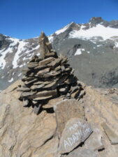 Da lì si risale ad un colletto dove c’è un masso tavolare. La Punta Adami è indicata da un grande ometto e dalla scritta in bianco su una roccia.