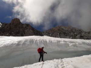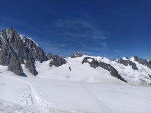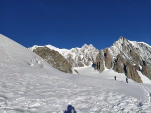 Si risale ora il ghiacciaio fin presso il Col d’ Entrèves 3517 m (ore 1,30).