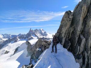 Superata la prima parte sul filo della cresta, la traccia prosegue senza troppa difficoltà più in basso, sul lato della Brenva. Sono presenti diversi ometti che segnano il percorso.