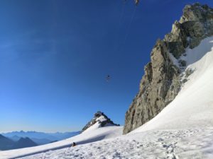 Usciti dalla stazione, si prende una scaletta metallica che scende verso il ghiacciaio sottostante. Qui si calzano i ramponi e ci si lega alla corda prima di proseguire sul Ghiacciaio del Gigante.